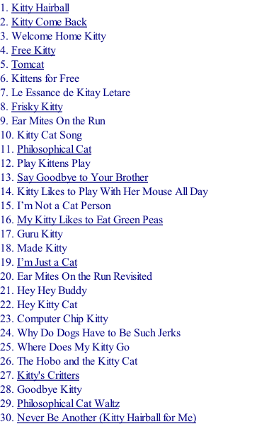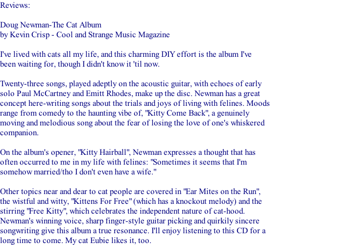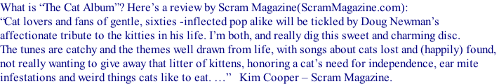 Kitty with Mic - Doug Newman The Cat Album, Cat Songs The Cat Album     by Doug Newman song clips: Doug Newman Music - page two Doug Newman Albums Doug Newman Song Lyrics Doug Newman : Contact Doug Newman Music - page three nice Seattle Weekly mention Kitty with Her Mouse - Doug Newman The Cat Album, Cat Songs Kitty with her mouse Kitty with mic Pokie and Rusty more photos Google Play Press: amazon Doug Newman Music - page one (the original ‘01 album) The Cat Album ‘14 (The Cat Album ‘14  (director’s cut) song list) © Doug Newman The Cat Album ‘14 (director’s cut) CD at CreateSpace CD at CreateSpace $14.99 CD at CreateSpace Kitty Philosophical Cat Waltz (new “The Cat Album ‘14” song) My Kitty Likes to Eat Green Peas  (original ‘01 album clip) me 2000 in the midst of kitten and cat mayhem me 2000 me ‘10 approx. me ‘09 The Fab Four - Rusty, Dusty, Clemintine and Pokie - Doug Newman The Cat Album, Cat Songs, Kitten Songs The Fab Four -            Rusty, Dusty, Clementine and Pokie iTunes pandora