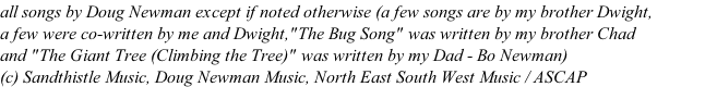 Cascade Creek by Doug and Dwight Newman My Dog Has Fleas - Doug Newman a little tune (a silly little tune) - Doug Newman I Love the Rain - Doug Newman Goin' to Winfield (Winfield Rag) Send Her Back to Me - Doug Newman Fishing with Grandpa a silent rain - Doug Newman Kittens for Free - Doug Newman Whistle Tune - Doug Newman The Sandhill Waltz The Coming of the Rain - Doug Newman Good Morning  - Doug Newman Ba Ba Ba - Doug Newman Turning Orange - Doug Newman Guitar Happy Time - Doug Newman the bug song - Doug Newman Mr. Spider - Doug Newman Indian Summer's Raga Lullaby - Doug Newman Old MacDonald's Farm Living in His Shoe - Doug Newman Happy Happy Birthday - Doug Newman I Loved Ginger - Doug Newman Gibson lg3 guitar - Doug Newman A Cowboy's Lament - Doug Newman (c) Sandthisltle Music / ASCAP   Indian Summer's Lullaby - Doug Newman bio - Doug Newman Song Lyrics: Doug Newman Contact: Doug Newman page two : Doug Newman Music Sea Anemones - Doug Newman page three : Doug Newman Music Guitar and Mandolin Serenade Doug Newman albums- Doug Newman Say That I Love You - Doug Newman A Country Boy and Girl - Doug Newman Ever the Rain          (with Mandolin) Bubbles in the Sea Doug Newman Music.com Cascade Creek              (banjo instrumental) Don’t Cry Bears              (with Mandolin) Buddy the Doggone Cricket Doug Newman music page five Bubbles in the Sea Six String Rag                      (mandolin instrumental) 14 Six String Rag - Doug Newman clip.mp3 Skating by Moonlight         (mandolin instrumental) The Archipelago (guitar instrumental) Doug Newman - The Archipelago Skating by Moonlight by Doug Newman Bye Bye Love             (banjo instrumental) youtube catalbum.com music: page one Parfinagled Spring Pudding - Doug Newman I Hear the Wind - Doug Newman Aint Comin' Back - Doug Newman Wish You Knew - Doug Newman Go Away from My Window - Doug Newman page one b doug newman page one handwritten © Doug Newman Scottish Mandolin As Long As I’ve Got You The Happy Ants  from “The Sandhill Waltz” from “The Sandhill Waltz” from “The Sandhill Waltz” from “The Sandhill Waltz” from “The Sandhill Waltz” from “Ba Ba Ba” from “Ba Ba Ba” from “Ba Ba Ba” from “Ba Ba Ba” from “Bugs and Critters” from “Bugs and Critters” from “Bugs and Critters” from “Bugs and Critters” from “Bugs and Critters” from “Bugs and Critters” from “Ba Ba Ba” from “Ba Ba Ba” from “Ba Ba Ba” from “The Cat Album” from “The Sandhill Waltz” from “Rain Songs (Songs for a Rainy Day)” from “Rain Songs (Songs for a Rainy Day” from “Rain Songs (Songs for a Rainy Day” from “Songs I’m Singing Right Now” from “Guitar Tunes” from “Guitar Tunes” from “Guitar Tunes” from “Guitar Tunes” from “Ba Ba Ba” from “Mandolin Tunes” from “Mandolin Tunes” from “Tin Can Avenue” from “Mandolin Tunes” from “Guitar Tunes” from “Guitar Tunes” from “Red Beans and Rice and Other Songs of the Dusty Trail” from “Red Beans and Rice and Other Songs of the Dusty Trail” from “Red Beans and Rice and Other Songs of the Dusty Trail” from “Red Beans and Rice and Other Songs of the Dusty Trail” The Giant Tree (Climbing the Tree) by Bo Newman available at iTunes ,Google Play The Giant Tree by Bo Newman - Doug Newman from “The Sandhill Waltz” from “Sierra Skies” from “Tin Can Avenue” from “Mandolin Tunes” from “Critters and Bugs” (with Mandolin) Google Play iTunes amazon (mostly song clips - with verse and chorus) 03 good morning by doug newman clip.mp3 11 the coming of the rain - doug newman clip.mp3 15 - I love the rain by doug newman clip.mp3 10 Ain't Comin' Back - Doug Newman clip.mp3 01 A Silent Rain by Doug Newman clip.mp3 from “Bugs and Critters”